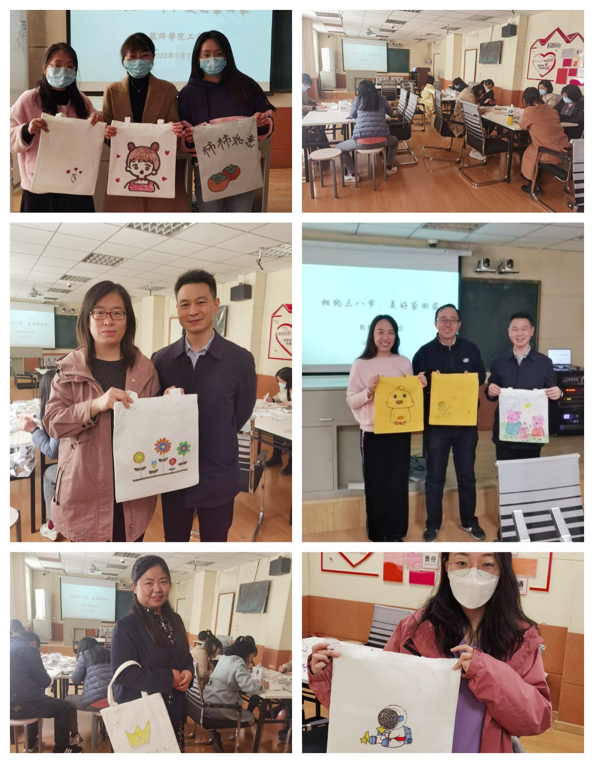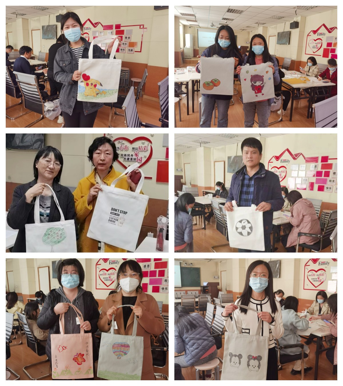 心怀暖阳,笑迎春光。各位老师放下粉笔,拿起画笔,发挥自己的想象力将帆布袋画成不同的风格,还有各种“联名款”闪亮出炉:花草树木精致可爱,小猪佩奇一家栩栩如生,小兔子、小鸭子逗趣生动......男教工们也动起手来,给爱人及家人送上自己亲手制作的包袋,满满心意满满祝福。老师们互相欣赏着对方的作品,赞不绝口,合影留念,现场氛围欢乐融洽。