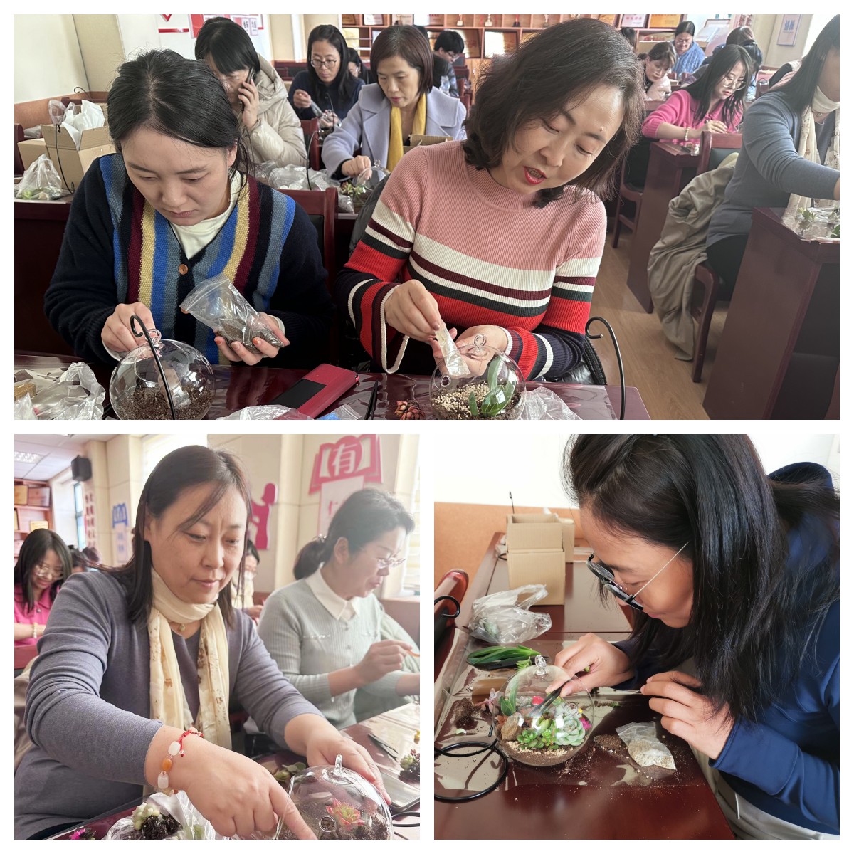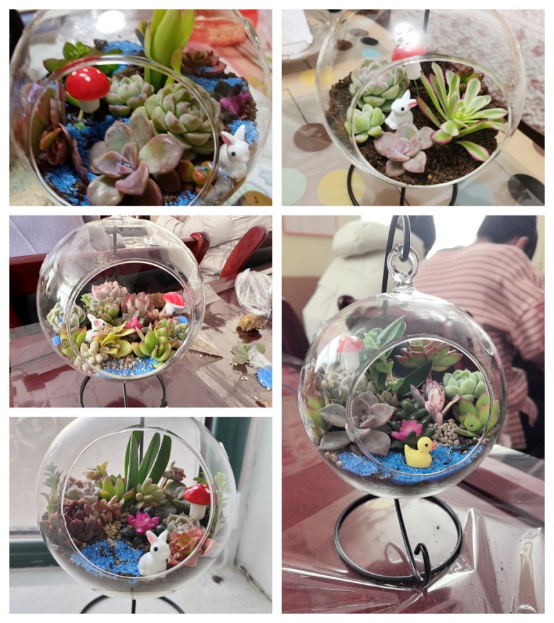 活动开始前,学院工会为每位教职工摆放好制作生态瓶所需的材料和工具,邀请了专业的老师为大家讲解了植物的种植及养护知识。在这特别的一天里,学院教职工暂时放下日常工作的繁重,全情投入到DIY的乐趣中。在制作生态瓶的过程中,各位老师发挥了自己的创意和巧思,用手中的多肉植物塑造出一件件既具设计性又富含美感的作品。每一个作品都是她们想象力与创造力的完美体现。
