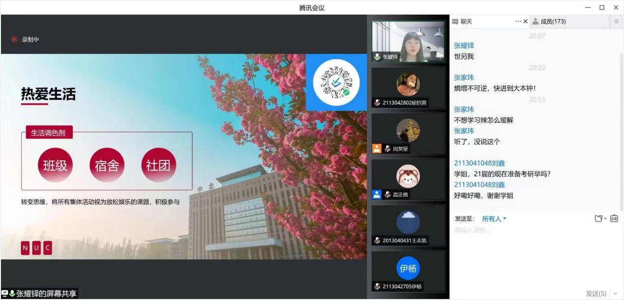 张耀铎同学,现已考研至广州医科大学继续攻读硕士学位。她以《把握机遇珍惜当下》为题,从生活、学业、考研、答疑四方面展开讲述,解答了很多关于考研及调剂方面的问题,让同学们收获很多。她从生活角度开启,运用了转变思维,将活动视为放松的课题,让学弟学妹们积极参与,让同学们对大学生活重燃了热血。
