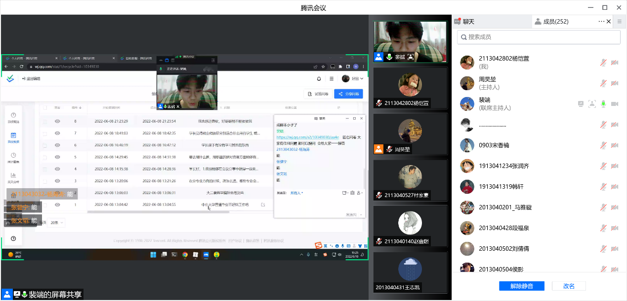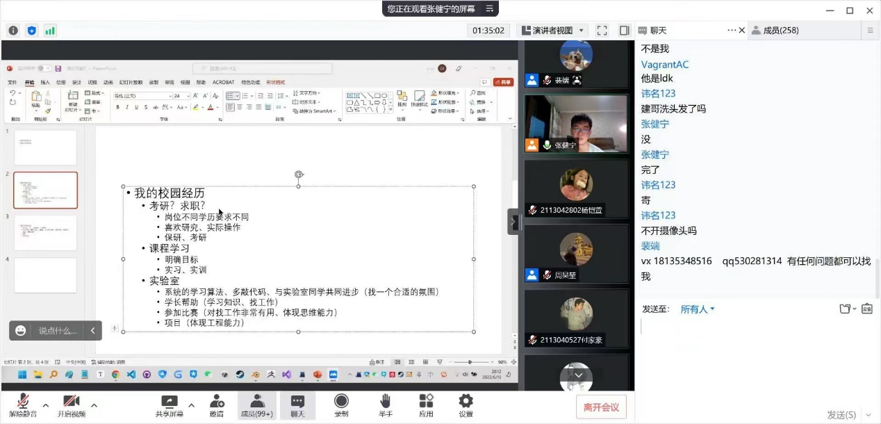 6月10日晚7点,由软件学院团委学生会主办的“榜样的力量”系列分享活动之应届毕业生“就业篇”分享会通过腾讯会议的形式线上开讲,本场活动邀请到了18级的两位优秀同学分享他们的就业经验,他们分别是18130045班的裴端同学和181300416班的张健宁同学。