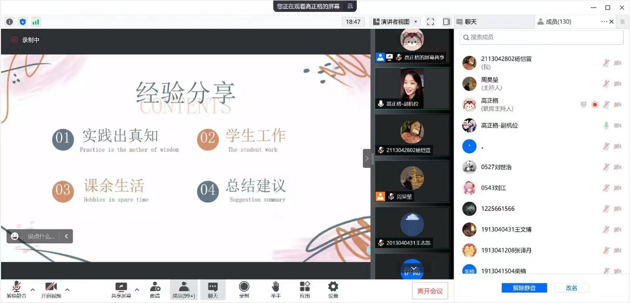 高正格同学,现已考研至长安大学继续攻读硕士学位。她以《不负热血不负卿》为题,以自己在学生工作和课余生活中的经验,向低年级同学们分享了做事的方法和态度,提出了好多学习生活中的建议,告诉同学们青春只有一次,要热爱生活。她从实践出真知、学生工作、课余生活、总结建议四个角度来进行这次的经验分享。同志们听完之后,不免陷入深深的思考。