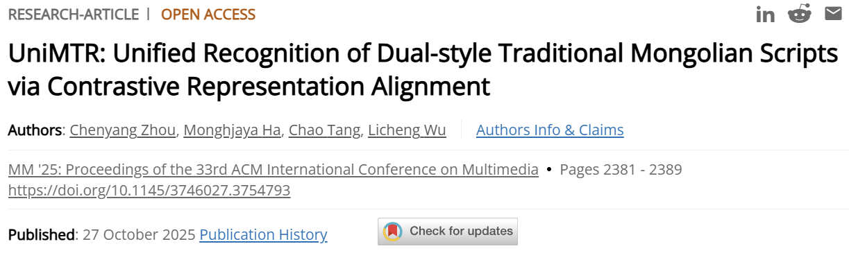 近日,我院青年教师周晨阳以中北大学为第一单位,联合内蒙古大学、中央民族大学在多媒体与人工智能领域顶级国际会议ACM Multimedia 2025(简称 ACM MM 2025)发表科技论文《UniMTR: Unified Recognition of Dual-style Traditional Mongolian Scripts via Contrastive Representation Alignment》。ACM Multimedia是由Association for Computing Machinery主办的国际顶级会议,被中国计算机学会(CCF)列为A类会议,是多媒体领域最具影响力的旗舰会议之一。