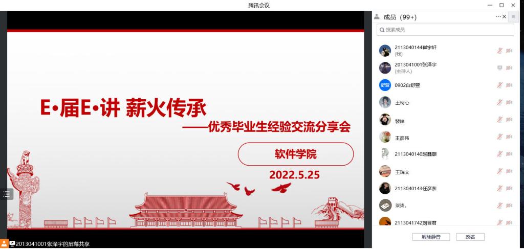 为深入落实全国高校思想政治工作会议和全国教育大会精神,充分展示2022届毕业生风采,发挥优秀学生的引领作用,鼓励带动软院学子向榜样看齐。2022年5月25日晚上19:00,软件学院于腾讯会议开展2022届优秀毕业生先进事迹报告会。软件学院学生各年级学生参加了此次活动,张泽宇担任主持人。