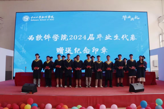 在热烈愉快的氛围中,学位授予仪式正式开始。学院学位评定分委员会主席强彦教授郑重宣读《中北大学软件学院关于拟授予2024届毕业生学位的决定》,主席台学院领导和学位评定分委员会委员为2024届52名硕士生和771名本科生授予学位,硕士、学士学位获得者依次上台接受学位授予、拨穗礼,并亲切握手合影留念。学院精心为全体毕业生准备了毕业纪念印章,一方印章,心心相印,毕业生代表手捧着带有学院殷切期望和祝福的印章,脸上洋溢着喜悦和自豪的笑容,“软院情”在仪式中愈加浓厚!