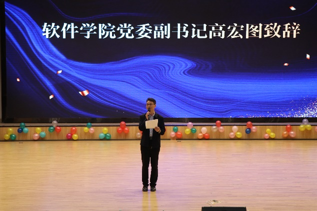 晚会在绚丽多彩的灯光秀中拉开帷幕,瞬间点燃了全场的热情。首先,软件学院党委副书记高宏图发表了热情洋溢的迎新致辞,对新同学的到来表示热烈欢迎,鼓励各位新同学在未来学习、生活中能够秉持“明德善思,笃行于新”院训的内涵精神,追求卓越实现自我价值,并希望新同学们能够在软件学院展现自己的才华、实现自己的梦想。