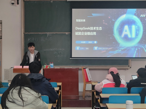 讲座中,青阳以深入浅出的方式,从人工智能领域的宏观发展趋势切入,系统阐述了DeepSeek技术诞生的时代背景与产业必然性。通过生动的案例和形象的比喻,成功激发了在场同学对前沿技术的浓厚兴趣。在深入探讨DeepSeek技术创新时,青阳不仅从技术原理层面进行了专业剖析,更通过精心设计的示例,将复杂的算法架构转化为易于理解的知识点,使在场师生受益匪浅。