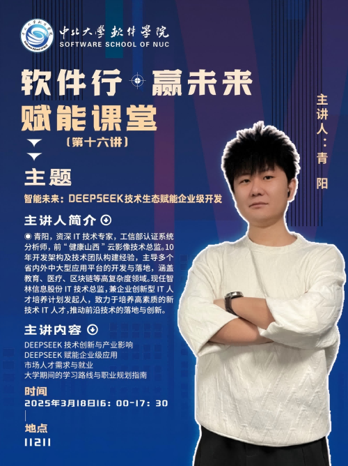 为助力学生把握前沿技术脉搏,提升专业素养与实践能力,拓展职业发展视野,2025年3月18日下午,软件学院在11211H教室成功举办"'软件行·赢未来'赋能课堂第十六讲——智能未来:DeepSeek技术生态赋能企业级开发"专题讲座。本次讲座特邀智林信息资深IT技术专家青阳担任主讲,乞国钰主持。