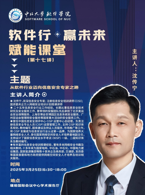 2025年3月25日下午,由软件学院主办的“‘软件行·赢未来’赋能课堂第十七讲——从软件行业迈向信息安全专家之路”在瑾瑜国际会议中心学术报告厅成功举办。本次讲座特邀资深信息安全专家、国资委央企万人网络安全培训计划授课讲师沈传宁老师担任主讲,软件学院党委副书记高宏图主持活动,讲座吸引了300余名师生参与。