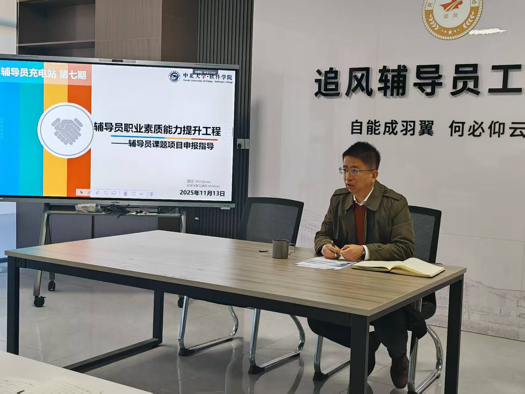 2025年11月13日上午10:00,软件学院在“追风逐梦”辅导员工作室举办第七期“辅导员充电站”,本期主题是辅导员课题项目申报指导。学院院长强彦教授担任主讲人,学院党委副书记高宏图主持讲座。