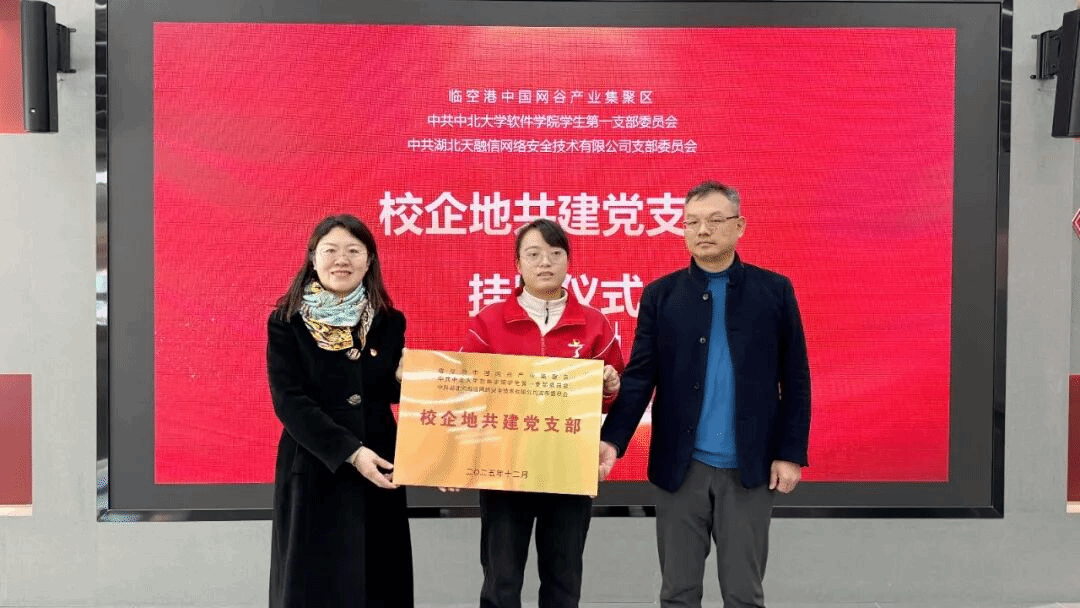 中北大学软件学院、武汉市临空港经济技术开发区、天融信科技集团三方举行了“校企地共建党支部”挂牌仪式,标志着合作迈入党建引领、深度融合的新阶段,为后续资源共享与协同育人奠定组织基础。