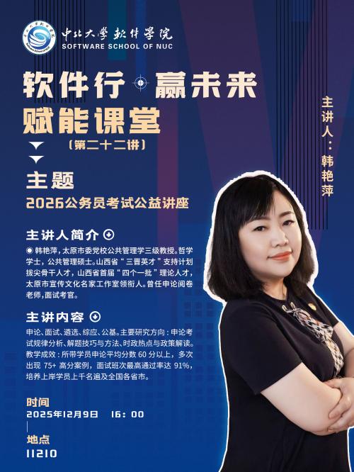 2025年12月9日,软件学院“软件行・赢未来”赋能课堂第二十二讲——公务员考试专题讲座在11210H教室成功举办。本次讲座特邀太原市委党校韩艳萍教授担任主讲嘉宾,她凭借其深厚的学术背景、多年申论阅卷与面试考官经验,为广大学子带来了一场兼具理论深度与实践指导的考公“干货盛宴”。