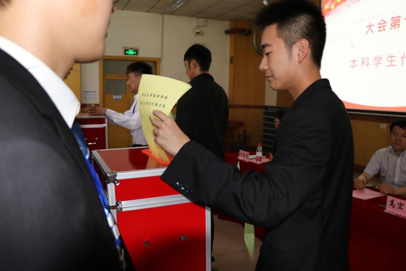 接着,工作人员宣读了候选人名单并介绍各位候选人的基本信息,庄重严肃的投票选举顺利进行。选举之后进行了休会,紧接着由计票人宣布计票情况并由软件学院团委书记双维宣布中北大学学生代表大会代表名单与第四届第一任学生主席团成员名单。