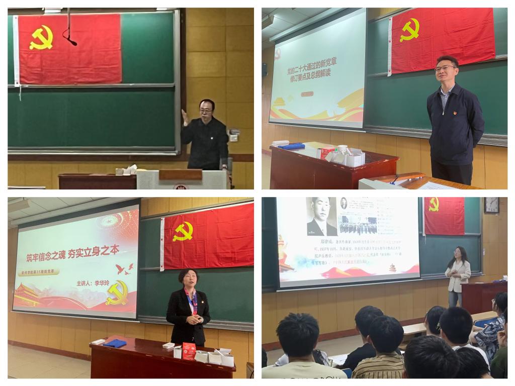 培训中,软件学院党委书记孙豫峰、软件学院党委副书记高宏图、学生第三党支部书记李华玲,学生第二党支部书记李晓敏,软件学院副院长李众,软件学院党委委员王宇灵,领域软件与软件服务工程党支部书记富丽贞,学生第一党支部书记成方圆,分别以《党的二十大报告全文解读》《党的二十大通过的新党章修订要点及总纲解读》《筑牢信念之魂,夯实立身之本》《党员的义务和权利》《努力践行中国共产党的根本宗旨和作风》《学习党史,铭记光辉历程》《党的指导思想》《端正入党动机,党员发展培育规范性》为题进行了专题党课讲授。在最后一次党课培训期间,所有学员进行了关于“经过党课的学习,同学们有什么思想转变和收获”的讨论。
