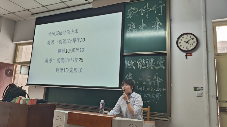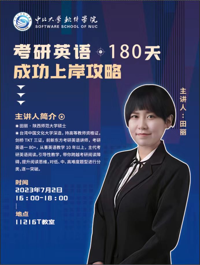 为了增强考研学生对考研英语的应考能力,帮助考研同学更好地备战考研英语,夯实考研英语知识能力,提高考研英语复习效率,软件学院于7月2日下午在11号教学楼216T教室举办了“软件行·赢未来”赋能课堂第二讲——考研英语180天成功上岸攻略。此次讲座特别邀请到田丽老师担任主讲。我院大二、大三70余名考研学生聆听了讲课,学院党委副书记兼副院长高宏图和就业辅导员贾乐亲临课堂。