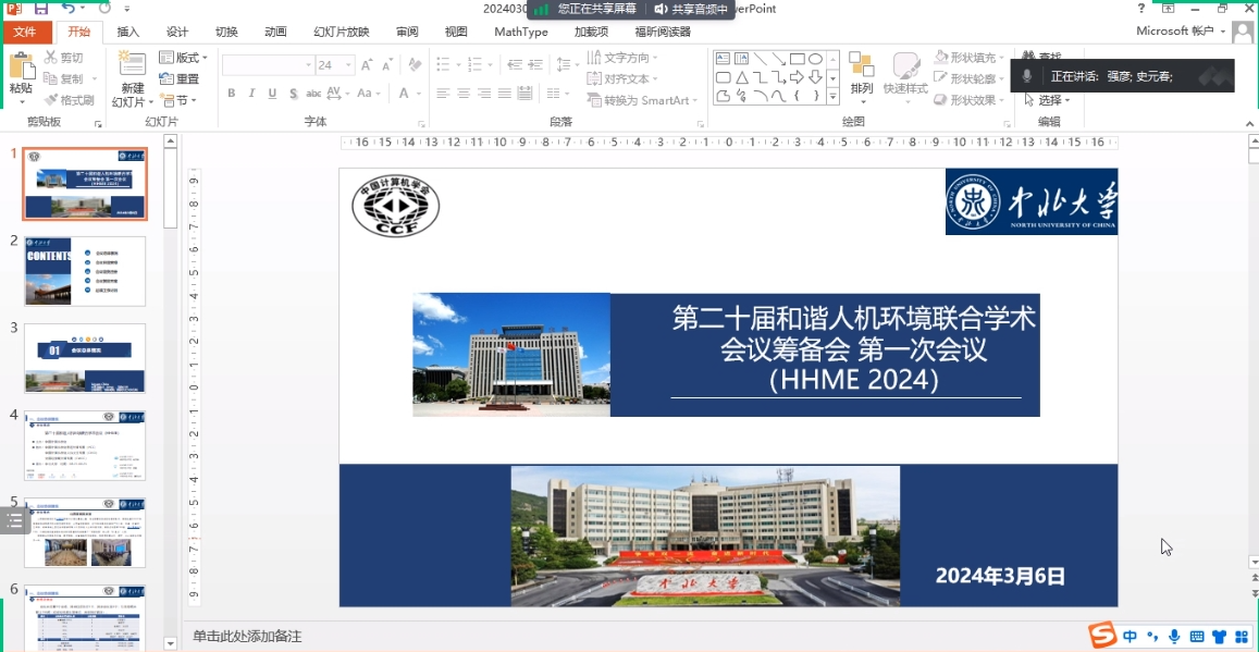 第二十届和谐人机环境联合学术会议(HHME2024)筹备会第一次会议2024年3月6日晚上19:30线上召开,大会由中国计算机学会主办,中国计算机学会人机交互专委(CHCI)、中国计算机学会普适计算专委(PCC)、全国可穿戴计算专委(CWCC)协办,中北大学承办;会议将于2024年08月23日—08月25日在太原举办。本次会议旨在进一步推进大会的各项筹备工作,确保大会的顺利举行。