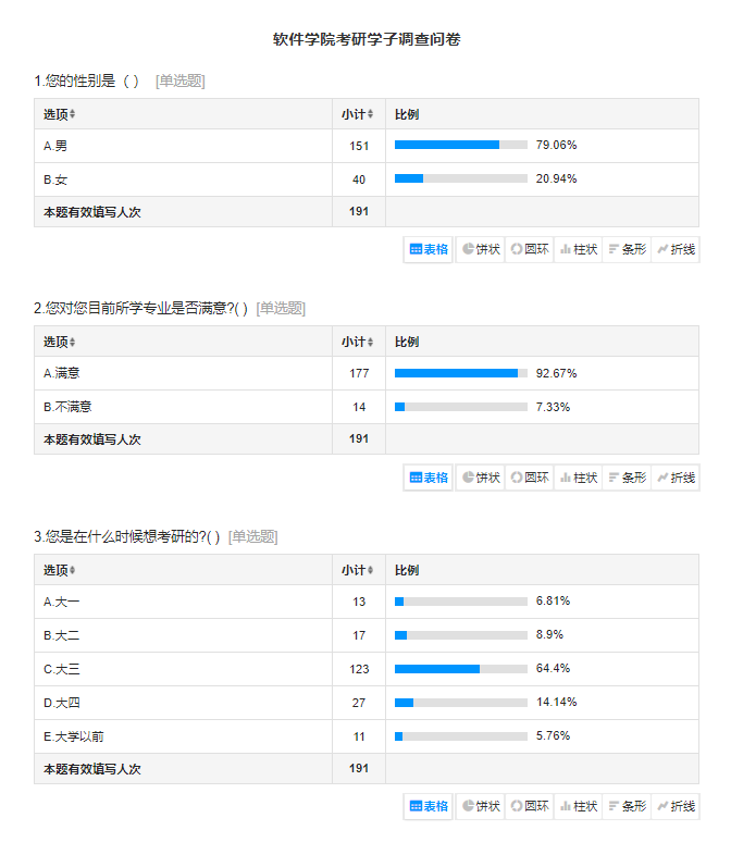 为进一步找准制约我院考研学子成功上岸的因素,我院前期专门制作了考研学子调查问卷,调查问卷共收回了190余份有效答卷。就本次开展的考研调研座谈交流会与考研调查问卷的数据显示,我院考研学生存在着考研科目存在偏科情况,部分同学英语或数字科目底子较差,报考院校选择不合理,考研缺乏准确的自我认知和定位,学习方法和复习计划不科学,学习自律性和主动性不强,缺乏了解报考院校专业科目的信息和渠道等方面存在不足。本次考研调研座谈交流会与回收到的调查问卷数据分析研究了软件学院学生的学习特点、问题和现状,进一步明晰了学院考研助推工作的思路,对提升考研助推工作质量和提高学生培养水平指明了方向。