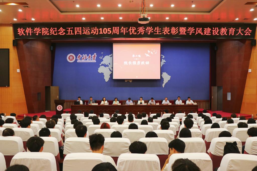 5月28日下午,软件学院纪念五四运动105周年优秀学生表彰暨学风建设教育大会在图书馆五层学术报告厅隆重举办。学院党委书记常旭青、院长强彦、党委副书记高宏图、教学副院长李众、系主任马巧梅、李华玲、付东来、学生科科长栾飞、团委书记双维及全体辅导员、班主任、教师代表出席会议。大会由学院团委书记双维主持。