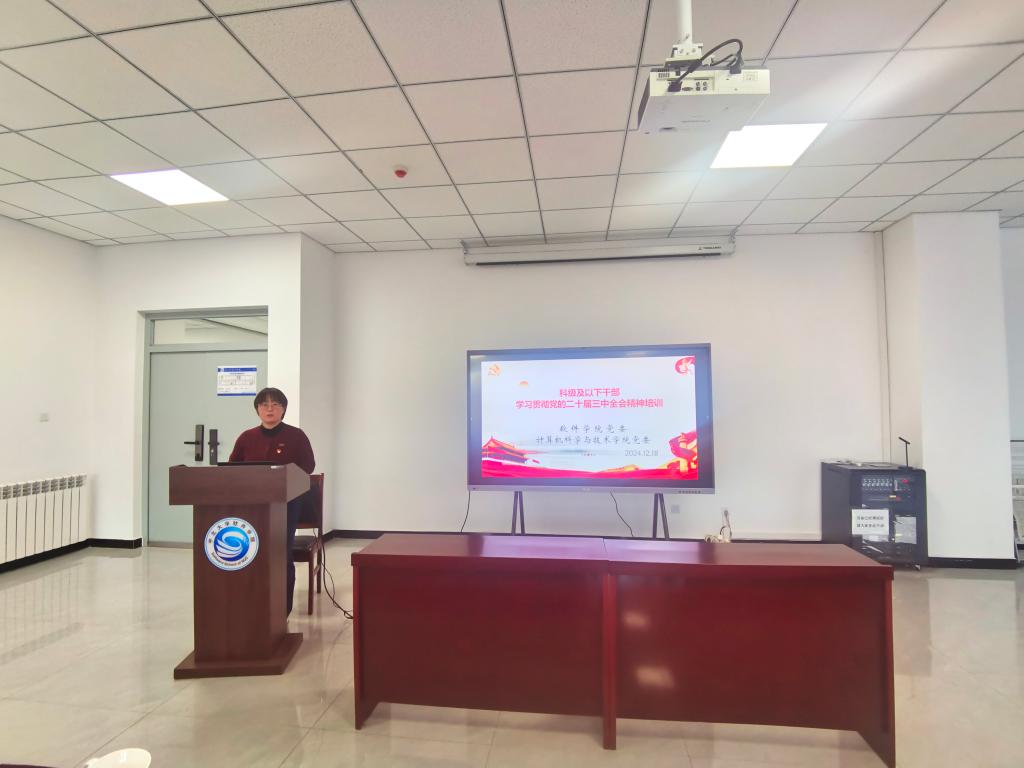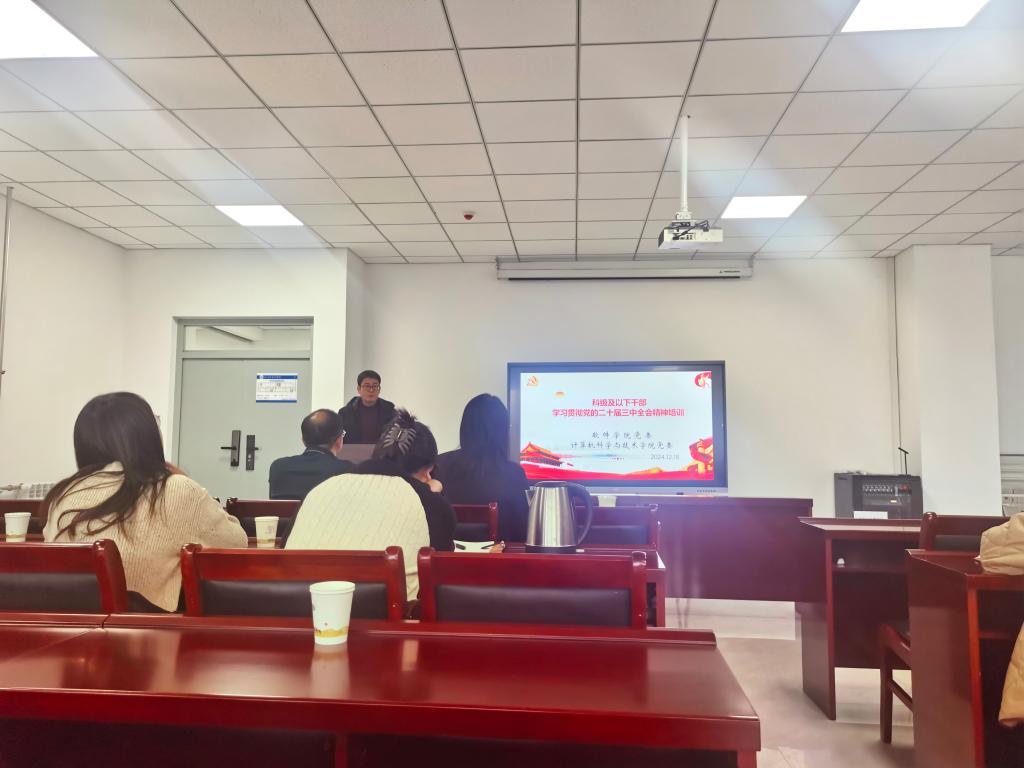 为深入学习贯彻党的二十届三中全会精神,提升干部队伍的政治素养和改革攻坚能力,2024年12月18日,计算机科学与技术学院党委与软件学院党委联合举办了科级及以下干部学习贯彻党的二十届三中全会精神培训班。培训班由软件学院党委书记常旭青主持,计算机学院与技术学院党委书记喻华兵作专题辅导,软件学院党委副书记兼副院长高宏图、两个学院的全体科级干部及党支部书记参加培训。