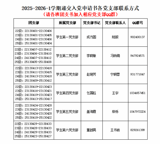 1.请各班级团支书加入所属党支部QQ群,于2025年9月26日以团支部为单位统一收齐,并审查本班级入党申请书的内容和格式是否符合要求,按照各党支部规定时间提交入党申请书和递交名单汇总表(附件2)。