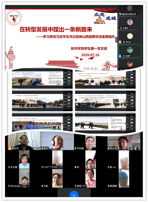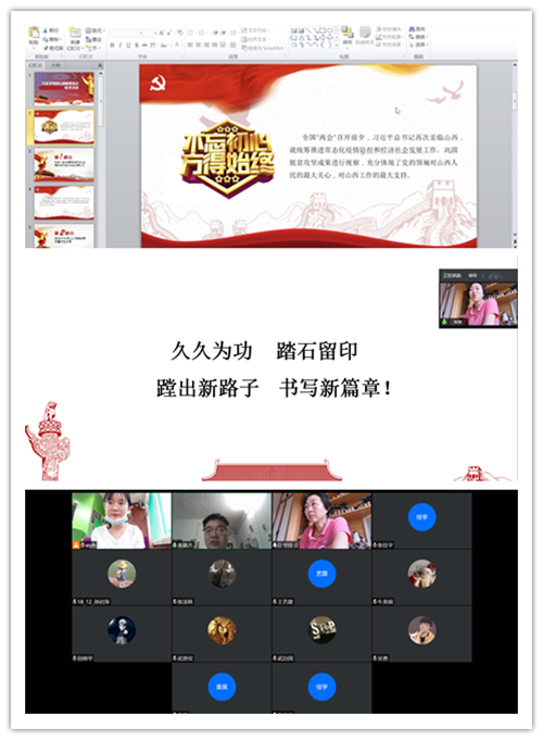 各支部书记也通过线上学习的方式组织各支部进行学习讨论。支部书记李华玲、乞国钰、李晓敏带领学生党员们围绕总书记视察山西的行程,对大同市云州区有机黄花标准化种植基地、易地扶贫搬迁西坪镇坊城新村、云冈石窟、综合改革示范区政务服务中心、汾河太原城区晋阳桥段、太钢不锈钢精密带钢有限公司的讲话和指示进行了详细的学习讨论。