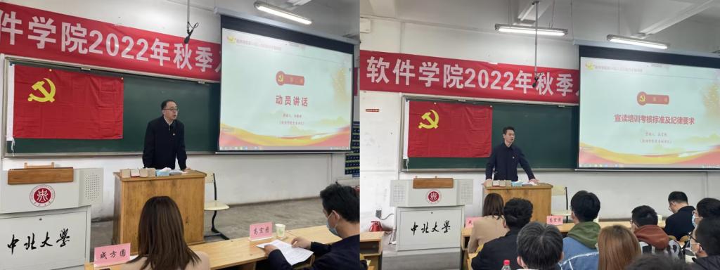 软件学院党委书记孙豫峰、党委副书记高宏图、研究生党支部书记魏跃亲、学生第一党支部书记成方圆、学生第四党支部书记乞国钰出席开班典礼,典礼由成方圆主持。