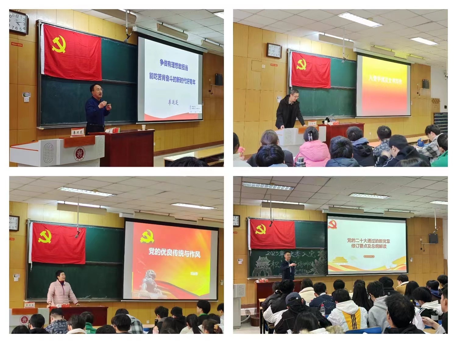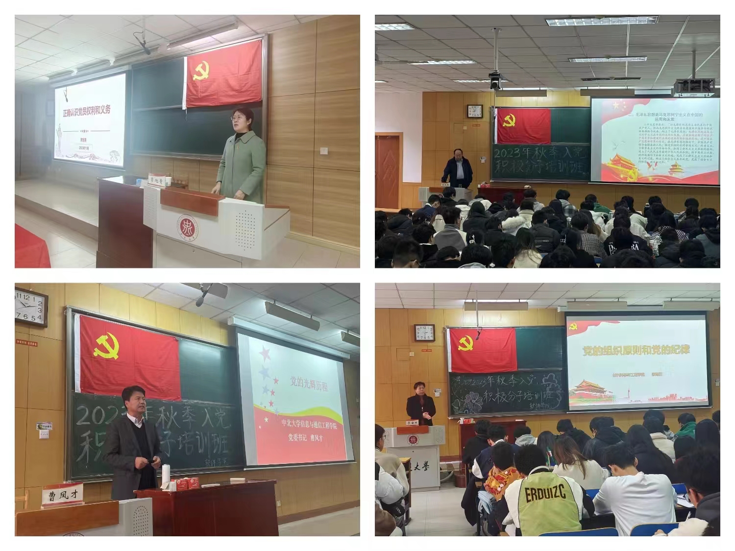 培训中,软件学院党委书记常旭青、马克思主义学院党委书记段义权、信息与通信工程学院党委书记曹凤才、材料科学与工程学院党委书记廖海洪、原能源与动力工程学院党委书记李运芝、人文社会科学学院党委书记孙俊伟、党委宣传部老师雷丽蓉、软件学院党委副书记兼副院长高宏图分别以《正确认识党员权利和义务》《党的指导思想》《党的光辉历程》《党的组织原则和纪律》《争做有理想敢担当能吃苦肯奋斗的新时代好青年》《入党手续及文书写作》《党的优良传统与作风》《党的二十大通过的新党章修订要点及总纲解读》为题进行了专题党课讲授。老师们的课程充实而深刻,极具思想性。通过展示丰富的历史资料、详实的数据和生动的案例,结合党的历史与新使命,从多个维度深入阐述了党的光辉历程、伟大贡献和新时代责任;从他们的工作经验、人生阅历中,诠释了党课培训的重要意义,为广大学员带来了一场场深入解析。同时老师们对入党积极分子提出的问题作出了细心、严谨、耐心的解答,让学员们受益匪浅。