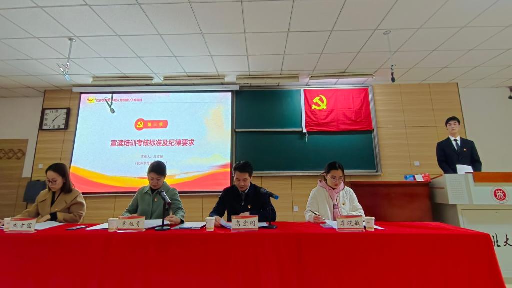 11月10日晚7点,开班典礼在雄壮的国歌中拉开帷幕,学院党委书记常旭青、党委副书记兼副院长高宏图、学生第一党支部书记成方圆、学生第二党支部书记李晓敏出席。常旭青同志对参加本期培训班的学员表示祝贺,强调了举办入党积极分子培训班的意义和要求,并对学员们提出三点要求:一是端正态度,珍惜本次集中培训学习的机会,进一步提升自己的思想觉悟,端正入党动机。二是明确学习目标,认真学习领会党课培训内容,进一步提高自己的政治理论水平,强化学习效果,要做到内化于心。三是严格要求自己,圆满完成培训的各项任务,进一步增强在实践中锻炼和考验自己的主动性、自觉性。高宏图同志宣读了考核标准及纪律要求,强调大家要充分认识到召开此次培训的重要意义,自觉遵守党课纪律,按时签到签退,上课认真听讲,认真书写心得。本期学员代表郭智源郑重承诺将严格遵守培训班的规章制度,以饱满的热情和奋发有为的实际行动投入到此次培训中。