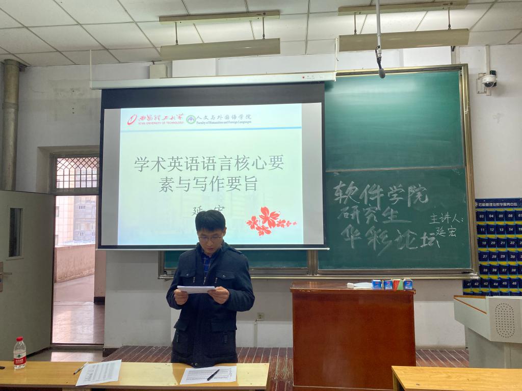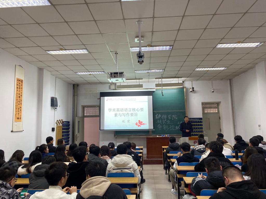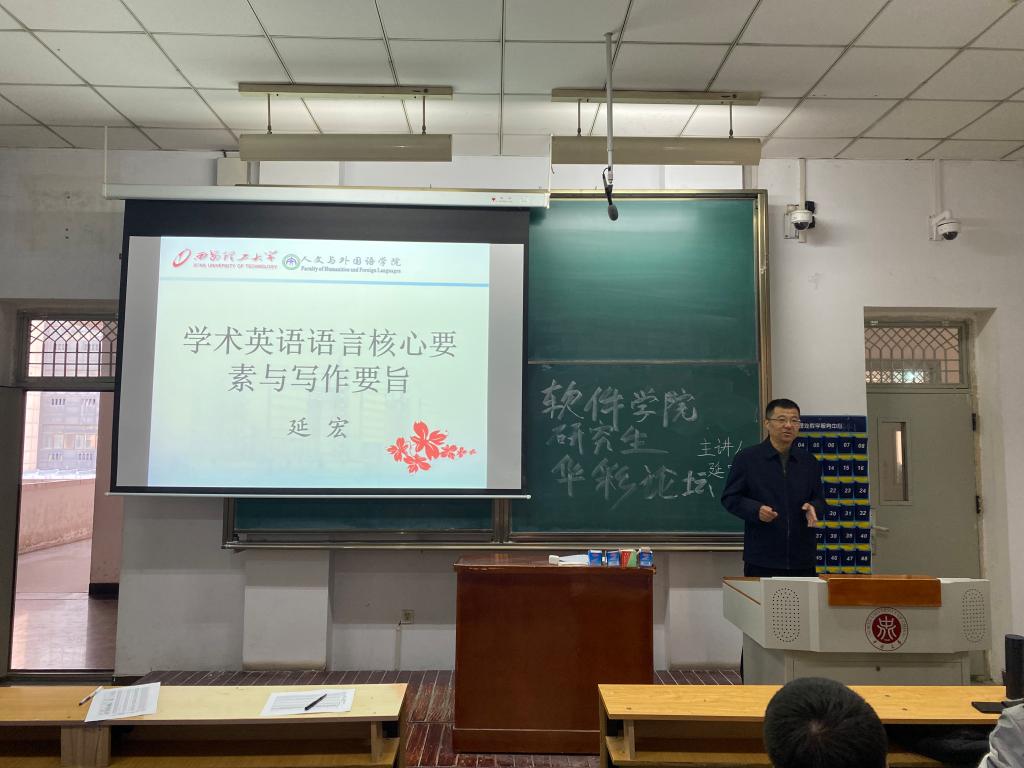 2024年11月7日,软件学院成功举办主题为“学术英语语言核心要素与写作要旨”华彩讲坛学术活动。此次讲坛有幸邀请到西安理工大学延宏教授,延教授是全国著名科技英语专家、西安理工大学学报编辑部英文译审,同时担任丝路翻译产业联盟总译审以及国家社科基金项目成果鉴定专家,其研究方向聚焦于学术英语翻译与写作。学院杜建海老师主持了活动。