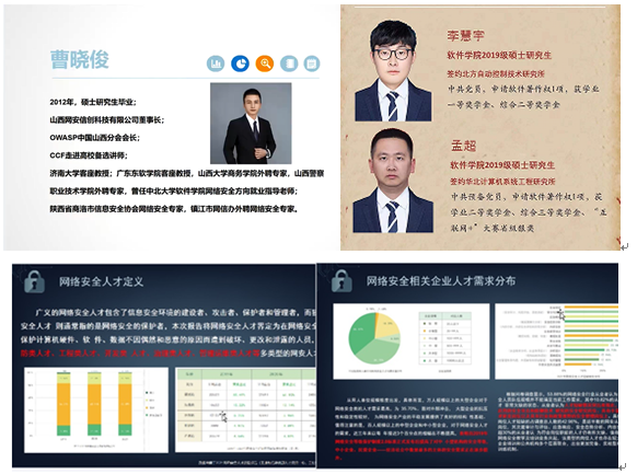 本次分享会邀请到山西网安信创科技有限公司董事长曹晓俊,2019级硕士研究生李慧宇、孟超。曹老师给大家详细分析了网络安全的发展趋势,讲解了网络安全这个研究方向在当下的就业情况,并强调沟通能力和工作经验在以后实习工作中的重要性。李慧宇同学结合自己的项目情况和实习经历告诉学弟学妹做选择要趁早,并为大家学习专业知识提供指导方向。孟超同学建议大家必须行动起来,在研究生期间多参加比赛,提升个人专业技能水平,并且尽早完成毕业要求。