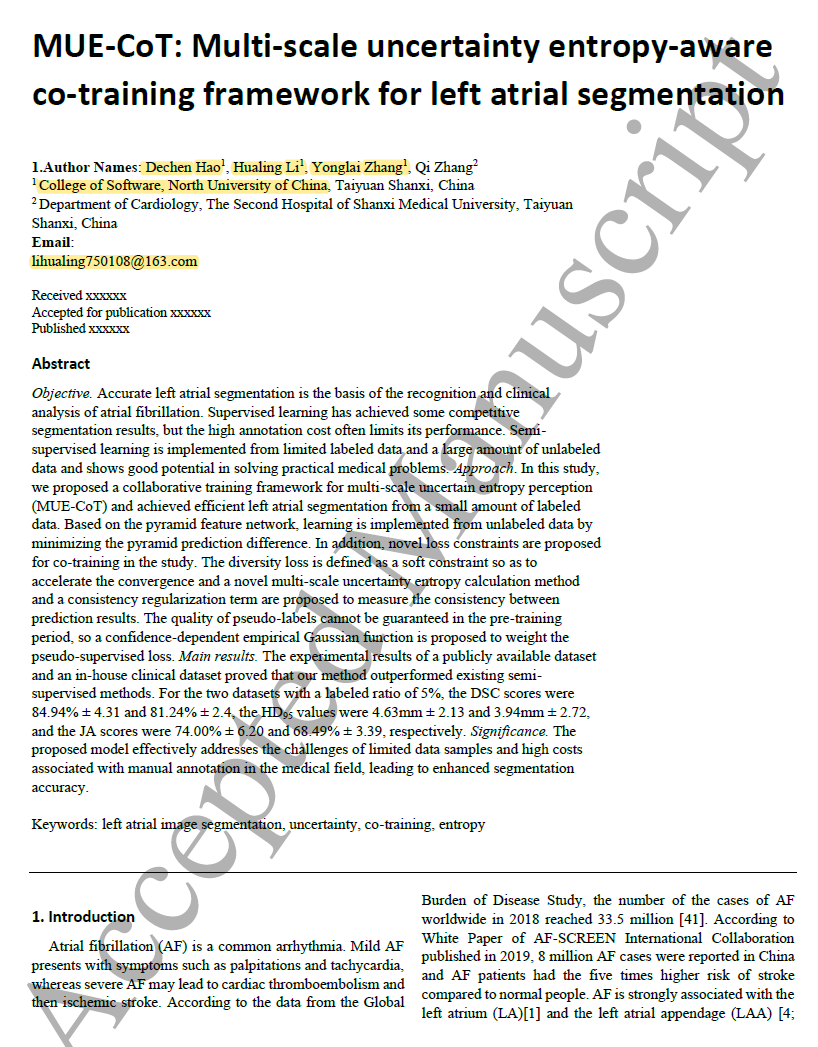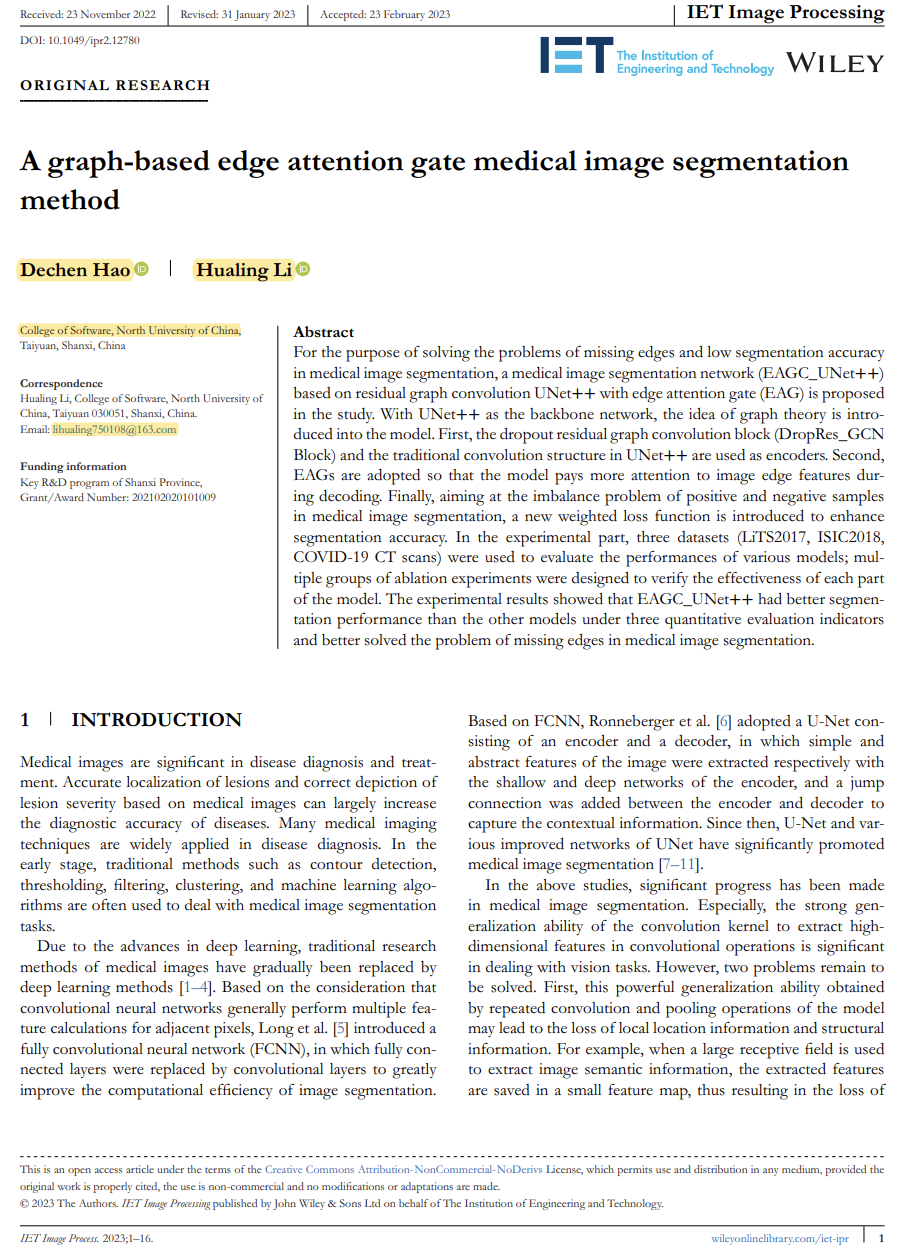 我院研究生郝德琛所在的李华玲副教授团队,目前正在承担山西省科技厅重大专项,在承担此项目的过程中,与山大一院、山大二院和太原市中心医院进行了非常深入的合作。由研究生郝德琛为第一作者、导师李华玲为通讯作者的论文“A graph-based edge attention gate medical image segmentation method”于2023年3月在《IET IMAGE PROCESSING》期刊发表。该研究成果发表后立即受到了全球学者们的广泛关注,在发表后的三个月内即获得了320次下载,位居该期刊中国作者第一季度发表文章三月内下载量前五,因此荣获2023年第一季度“Wiley中国开放科学高贡献作者”荣誉,这是我院研究生和老师首次获得此奖项。