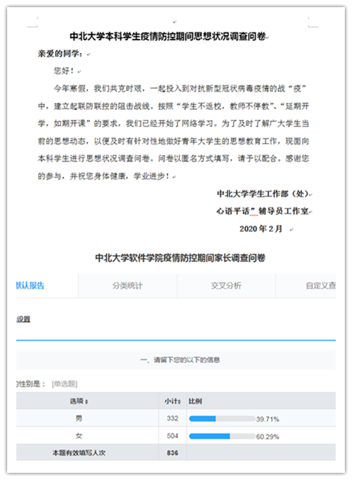 疫情防控期间,学院积极运用网络架起与学生和家长沟通的桥梁。通过问卷星设计调查问卷及时了解学院学生在家的思想动态,近期又面向家长发布了调查问卷,家校携手,全面了解学生在家期间的思想和学习等情况,以便及时有针对性地开展教育工作。