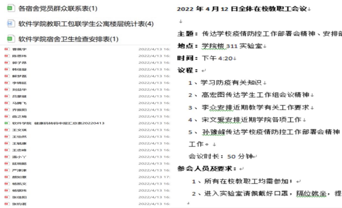 建立学生管理台账,做到底数清、情况明。目前软件学院第一批返校245人,第二批返校2357人,请假离校11人,现在校人数2591人,其中本科生2511人,研究生80人。本科学生人数多班级多,学院辅导员老师和班主任老师们每天睁眼的第一件事就是查看群内是否有新的工作通知,在做好上传下达的工作基础上,每位老师及时了解班内每位学生的情况,做到精准掌握每位在校学生的情况,做好学生管理台账。有情况及时汇总上报,班内遇有学生健康码被赋黄码或红码的,班主任老师第一时间收集汇总上报给学院,由学院汇总后第一时间上报给学生处,做到信息报送畅通,工作落实无阻。