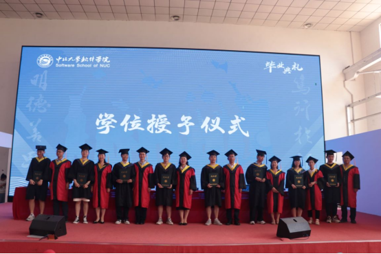 在热烈愉快的氛围中,学位授予仪式正式开始。学院学位评定分委员会主席强彦教授郑重宣读《中北大学软件学院关于拟授予2024届毕业生学位的决定》,主席台学院领导和学位评定分委员会委员为2024届52名硕士生和771名本科生授予学位,硕士、学士学位获得者依次上台接受学位授予、拨穗礼,并亲切握手合影留念。学院精心为全体毕业生准备了毕业纪念印章,一方印章,心心相印,毕业生代表手捧着带有学院殷切期望和祝福的印章,脸上洋溢着喜悦和自豪的笑容,“软院情”在仪式中愈加浓厚!