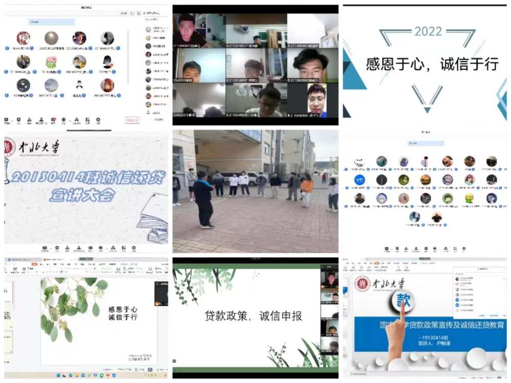 2022年5月29日下午四点,学院专门组织全体2018级贷款毕业生于线上召开本次资助教育活动,会上辅导员盖海霞针对学生处《关于做好2022年度学生资助诚信主题教育活动的通知》文件内容要求,对18级贷款生毕业确认工作的要点进行了宣传讲解,同时针对贷款注意事项为参会学生进行问题答疑,引导学生树立诚信还款意识。