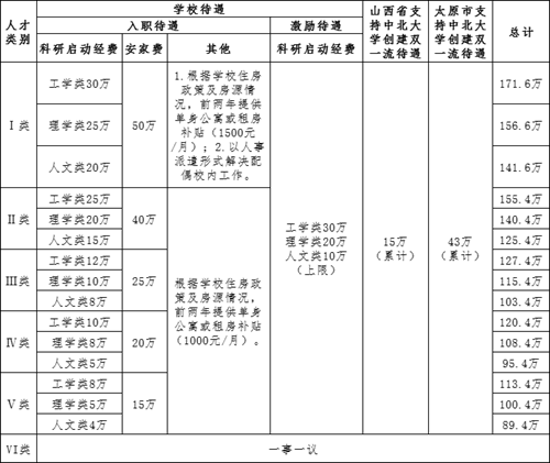 1、以上为各类别引进待遇最高额度,包含山西省、太原市支持中北大学创建双一流提供的人才引进待遇,学校待遇具体按照下面第2条执行,省市待遇发生变动时以申请当年省市政策为准;
